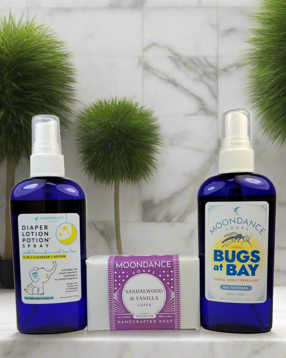 This bundle is for the family! Sandalwood Vanilla exfoliating soap followed by our favorite outdoor bug spray that’s safe for everyone’s skin, face and hair. Use organic Diaper Lotion potion as a skin cleanser and moisturizer for the little ones on the go. These two sprays are natural and so handy to have in your bag this summer! Apply these products liberally all day and see what great things plants can do for your whole family!