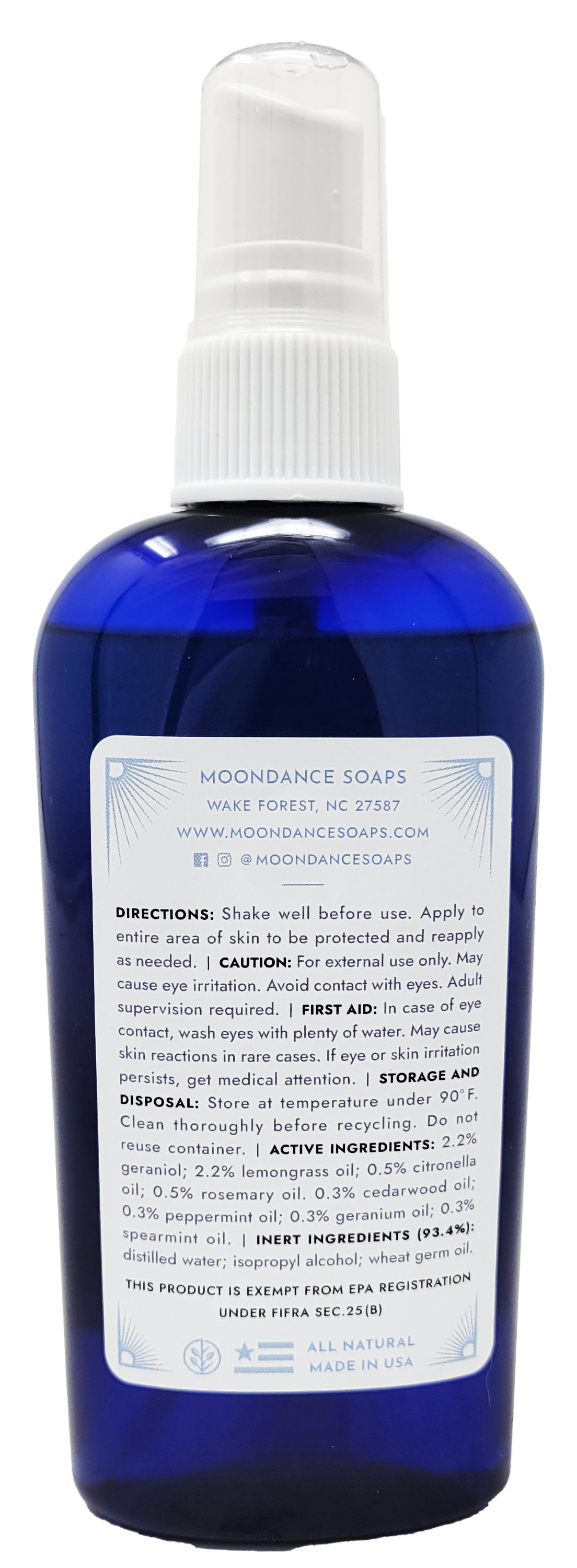 Active Ingredients: 2.2% geraniol; 2.2% lemongrass oil; .5% citronella oil; .5% rosemary oil; .3% cedarwood oil; .3% peppermint oil; .3% geranium oil; .3% spearmint oil